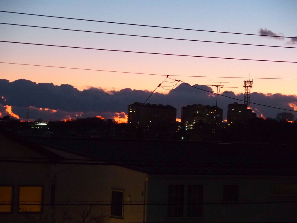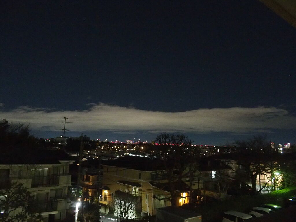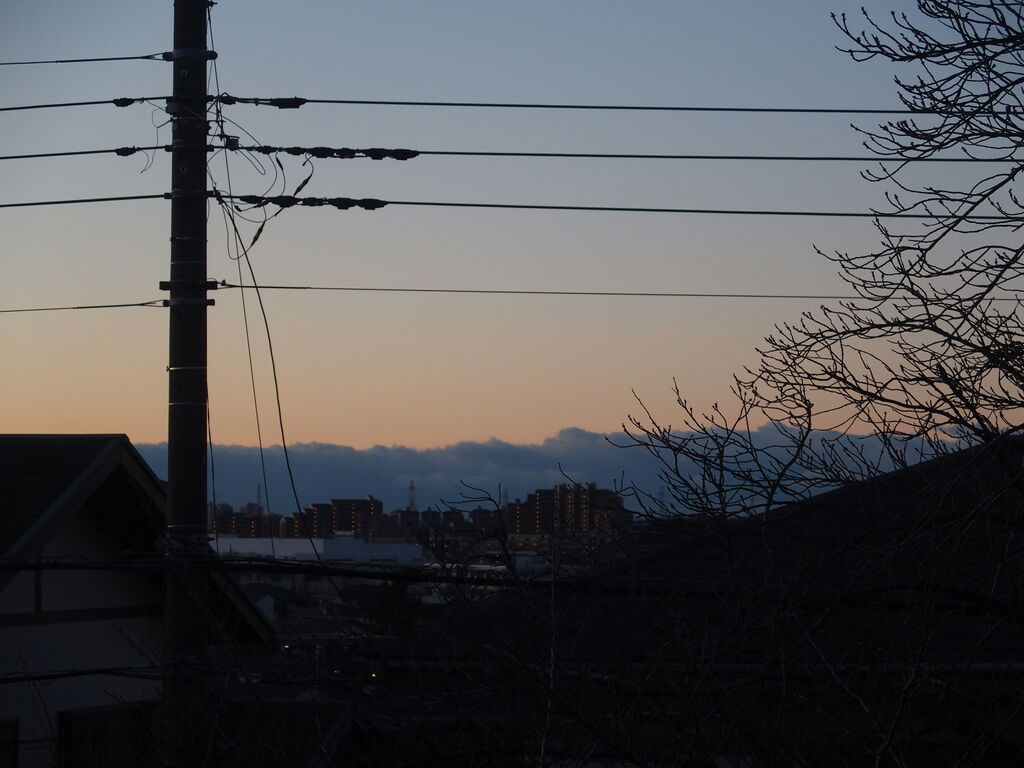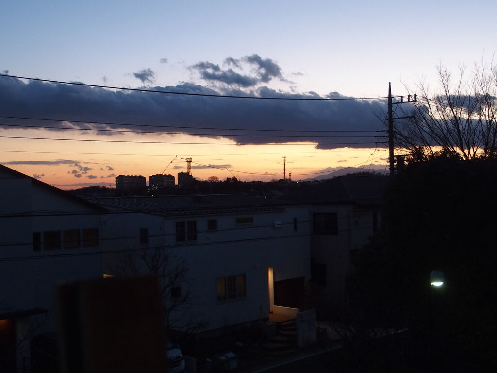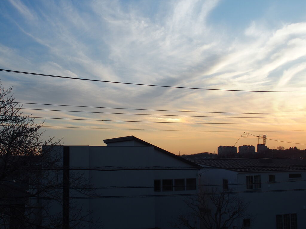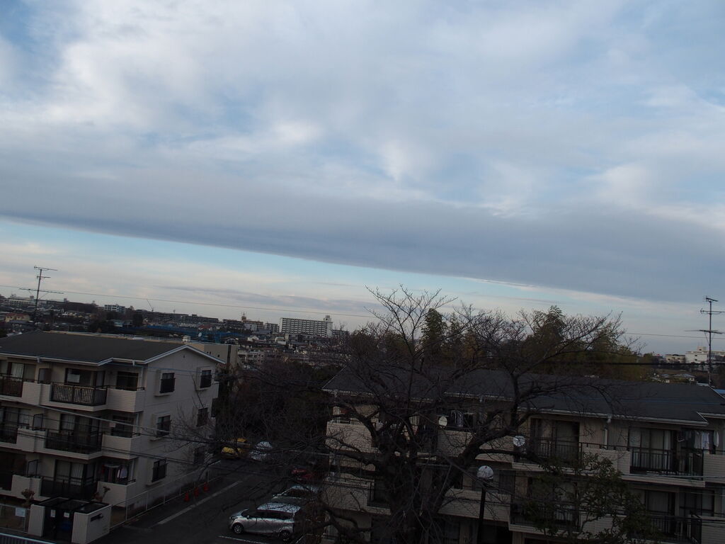 1月元旦の地震はここ川崎でも大きく揺れた。寝たきりの主人を守るべくベットのそばに駆け寄り様子を見るしか手はない。 「地震が来ても逃げられないものね」と言って笑った。 今日カメラを取り出したのは北側に大きな帯状雲が現れたからだ、今日の日付はかろうじて表記できたが元日の写真は確かな記憶のみ。 ブログに残したいが、久しぶりのブログで写真のアップに方法を忘れていて手間取った。